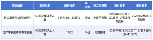 国产带状疱疹疫苗:40岁及以上人群。(在2025年8月22日至2025年12月31日期间完成接种即可享受半价减免。)